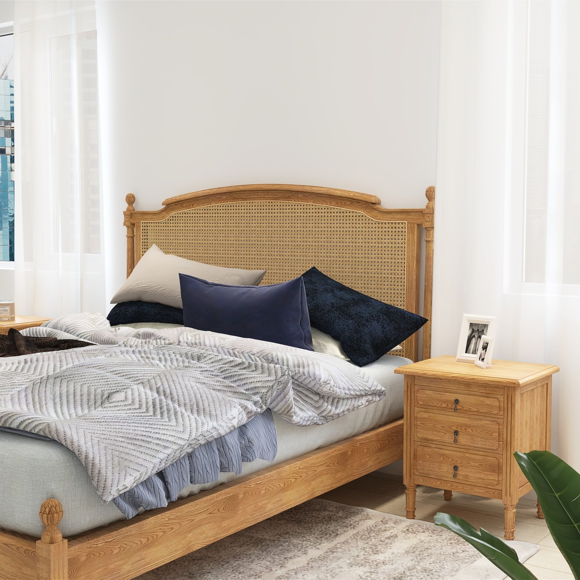 传统的复古风,围绕着家具款式和挂饰摆件的渲染;在这个空间,我们向自然致敬,融入原木、植物藤的元素,营造轻复古风。