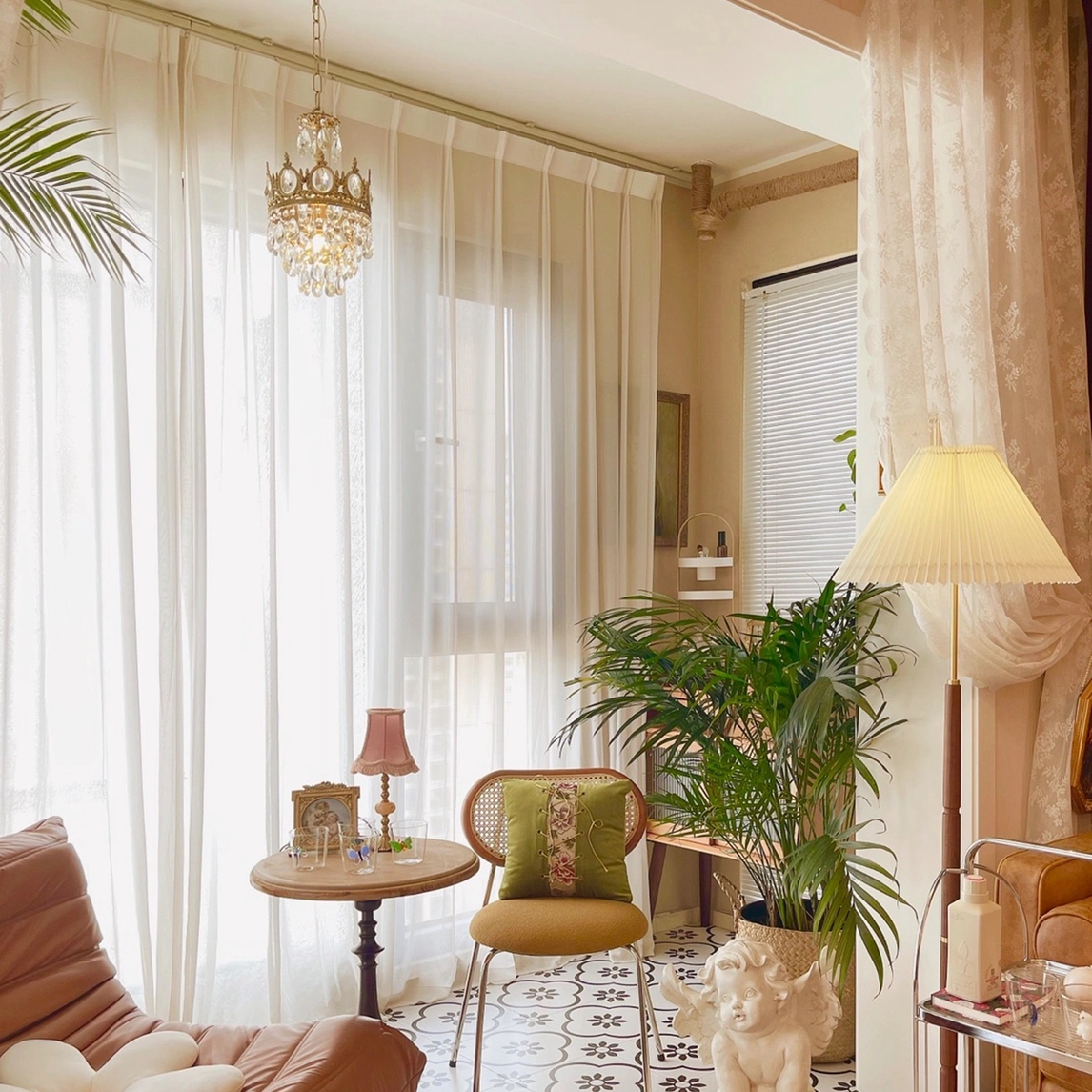 复古风的小窝,真的好美好温馨啊,好喜欢~ 开放式阳台,家里看着也很宽敞 复古吊灯,台灯,落地灯,都是很美的,超有氛围。