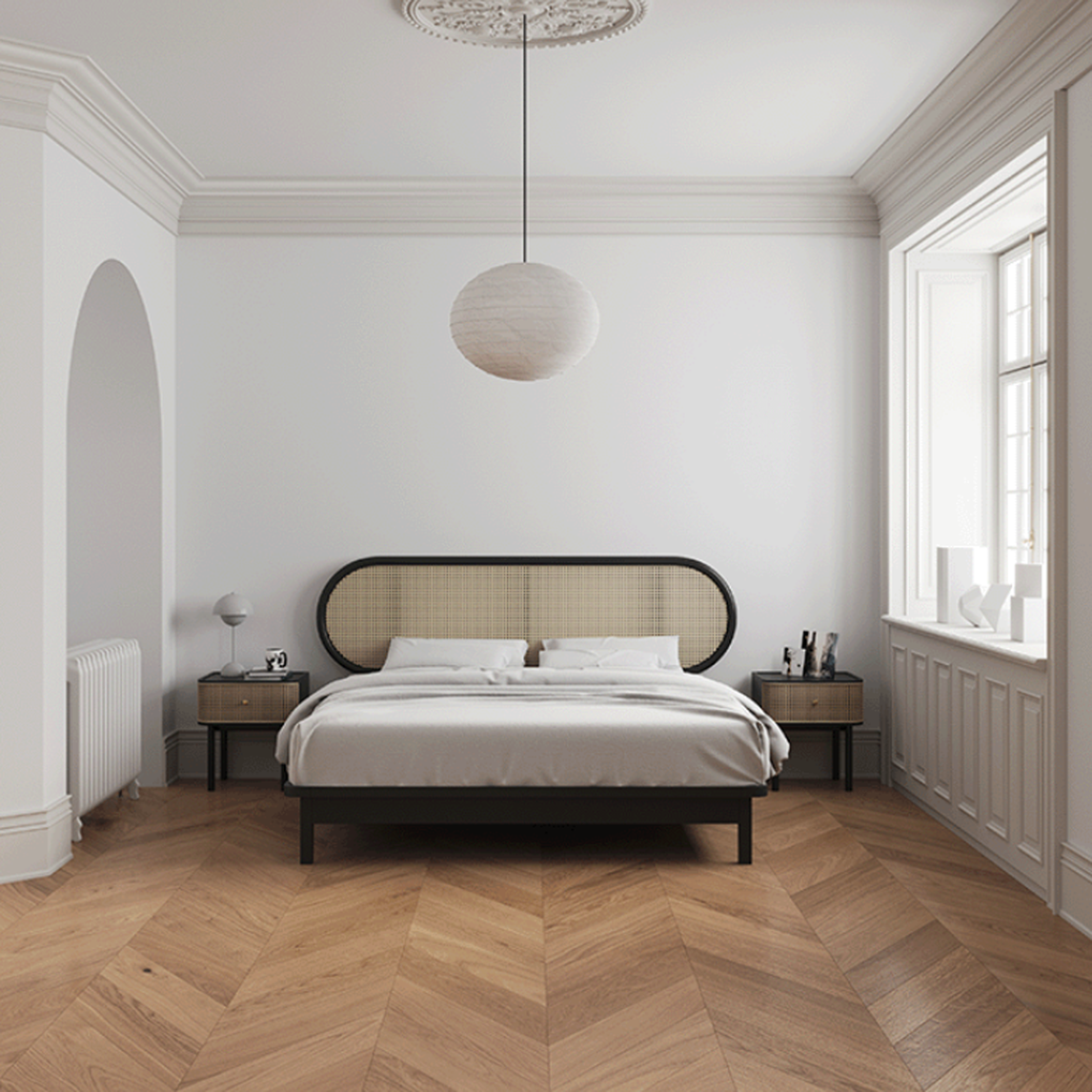 床和床头柜采用了藤编元素打造,散发着浓郁的文艺复古气息,同时为为空间带来轻巧、整洁的视觉感,让你的卧室表现得别具一格。