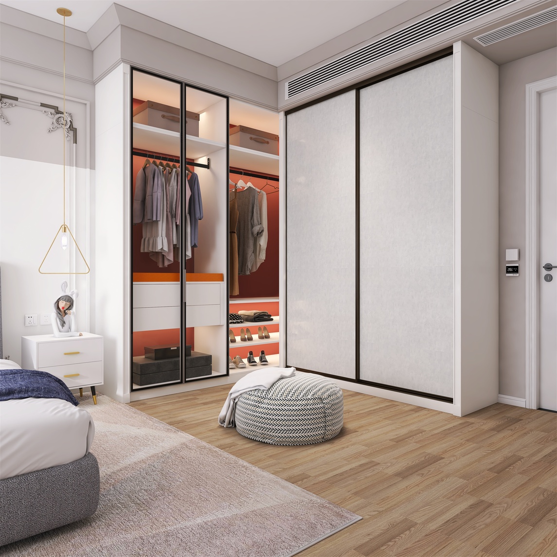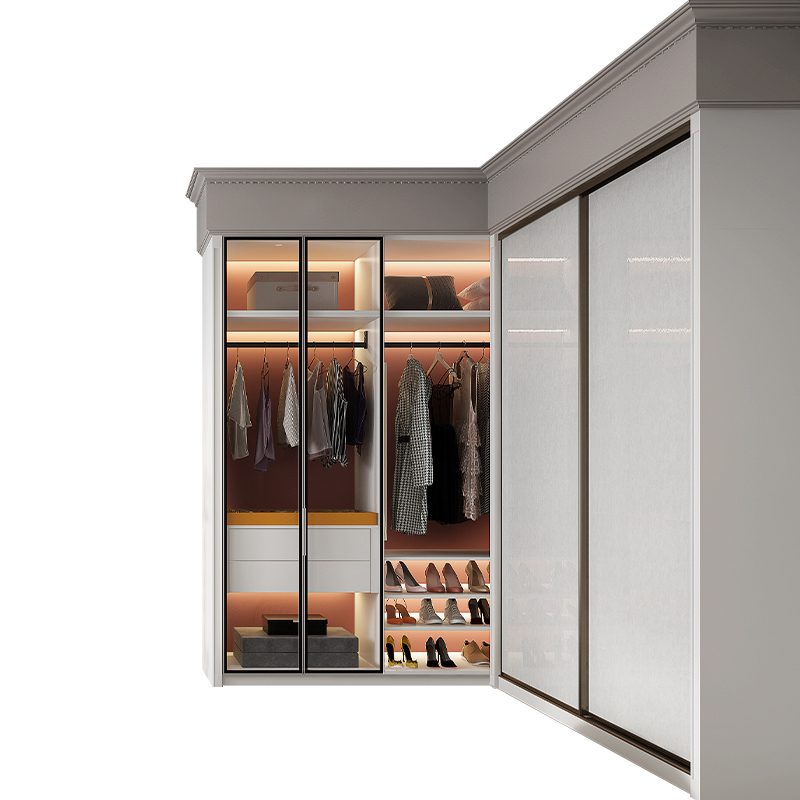 设计师将法式的唯美与现代的清爽结合在一起,在简约之中又带有细节与浪漫,整个色彩灰度和谐统一。转角柜体设计,封闭推拉柜门节省更多空间,而通透玻璃柜门,让柜内收纳一目了然,轻松挑选当天想穿的衣服。柜体柜体...展开