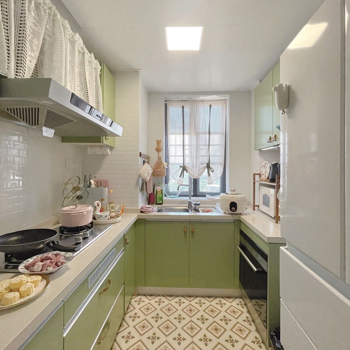 厨房的色彩非常小清新,美美哒~ 我家抽油烟机是方太的,大品牌真的好用。 厨房东西太多了,所以我买了几款置物架,用着都很方便。 家电是九阳的,也是大品牌。