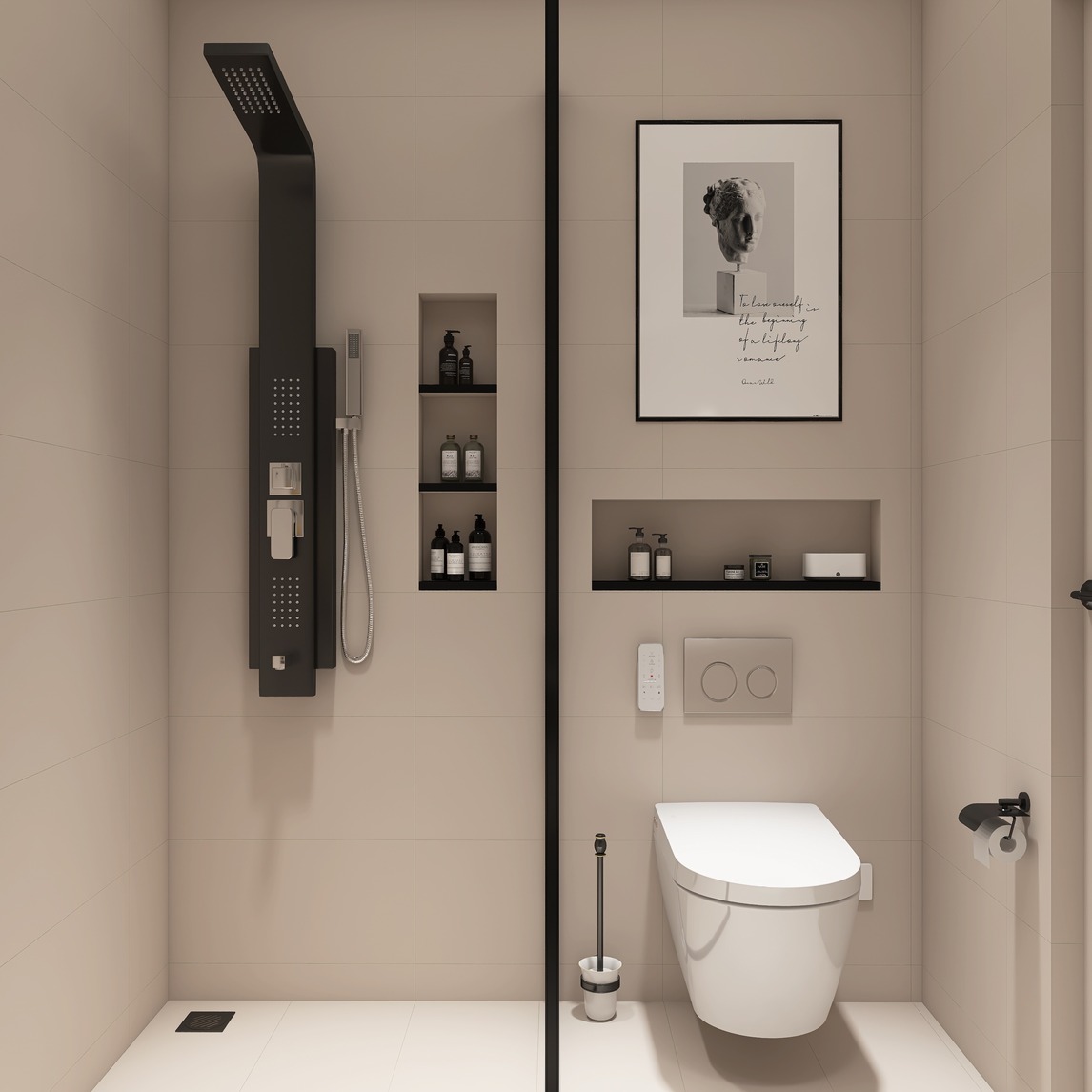 在装修风格,以及生活色彩的搭配中,奶茶色是罕见的颜色,全屋浴室微水泥打造出来的奶茶色,一体化,视觉上看起来更开阔。