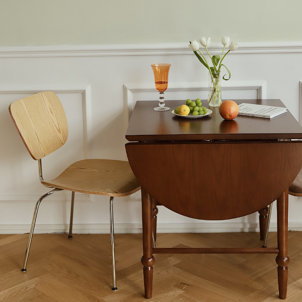 法式复古折叠餐桌,可折叠功能让小户型空间更有包容性,深柚木色呈现出中古的气息,百看不腻,桌腿的设计也让餐桌更有层次感。