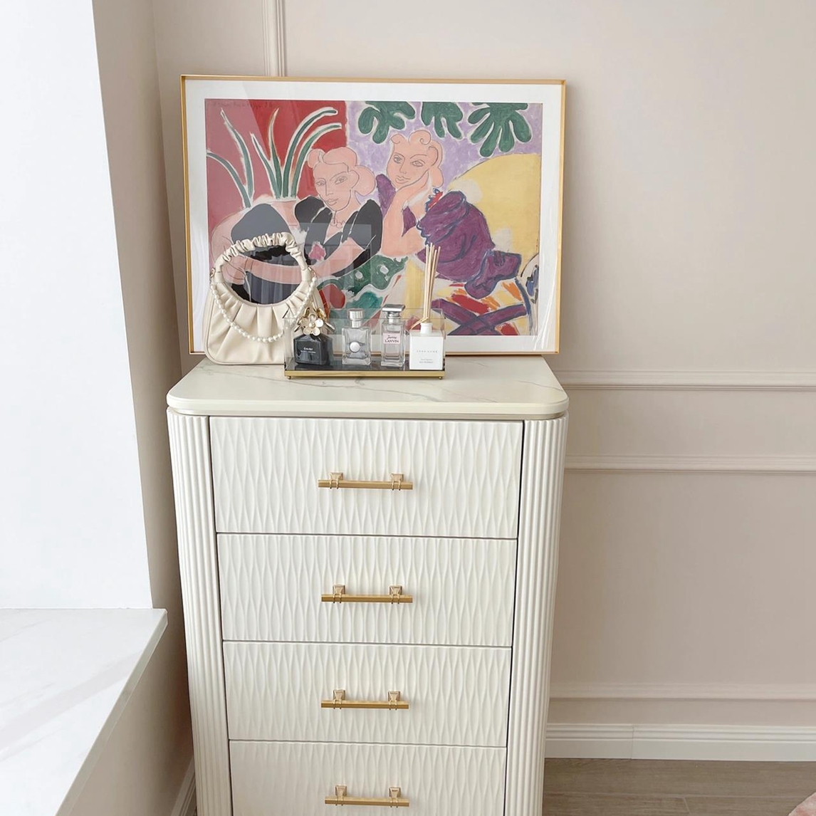 主卧的床选择了美式是米醋哈UN过,高靠背设计非常有格调,搭配纯色四件套,粉嫩的感觉,搭配水晶吊灯就是公主的卧室吧,床尾的地方布置了一个斗柜,增加收纳空间避免凌乱。