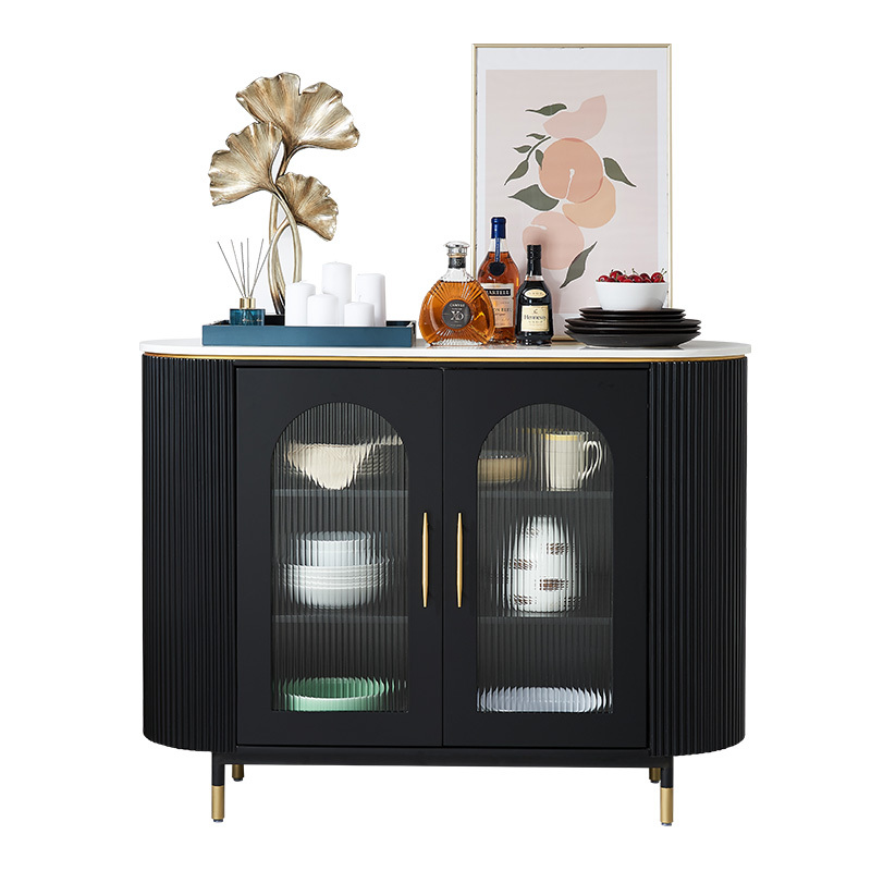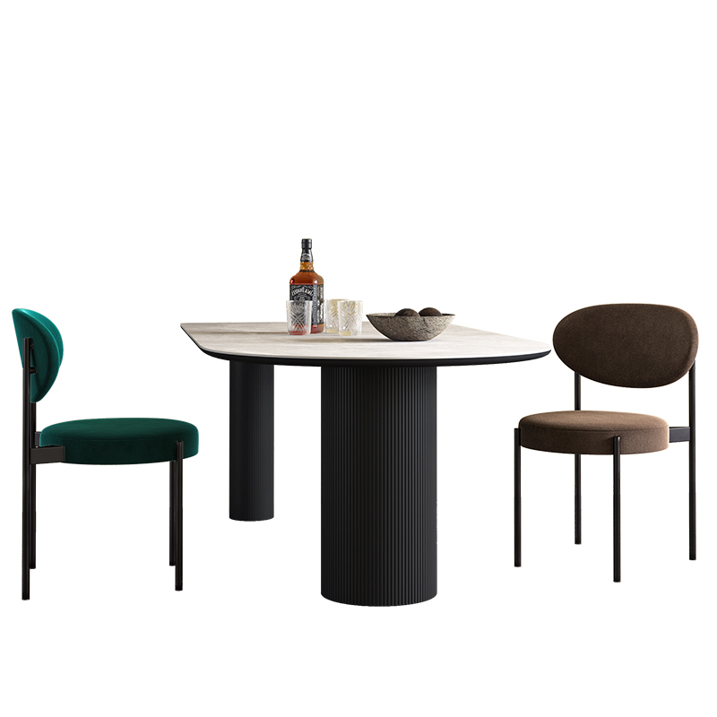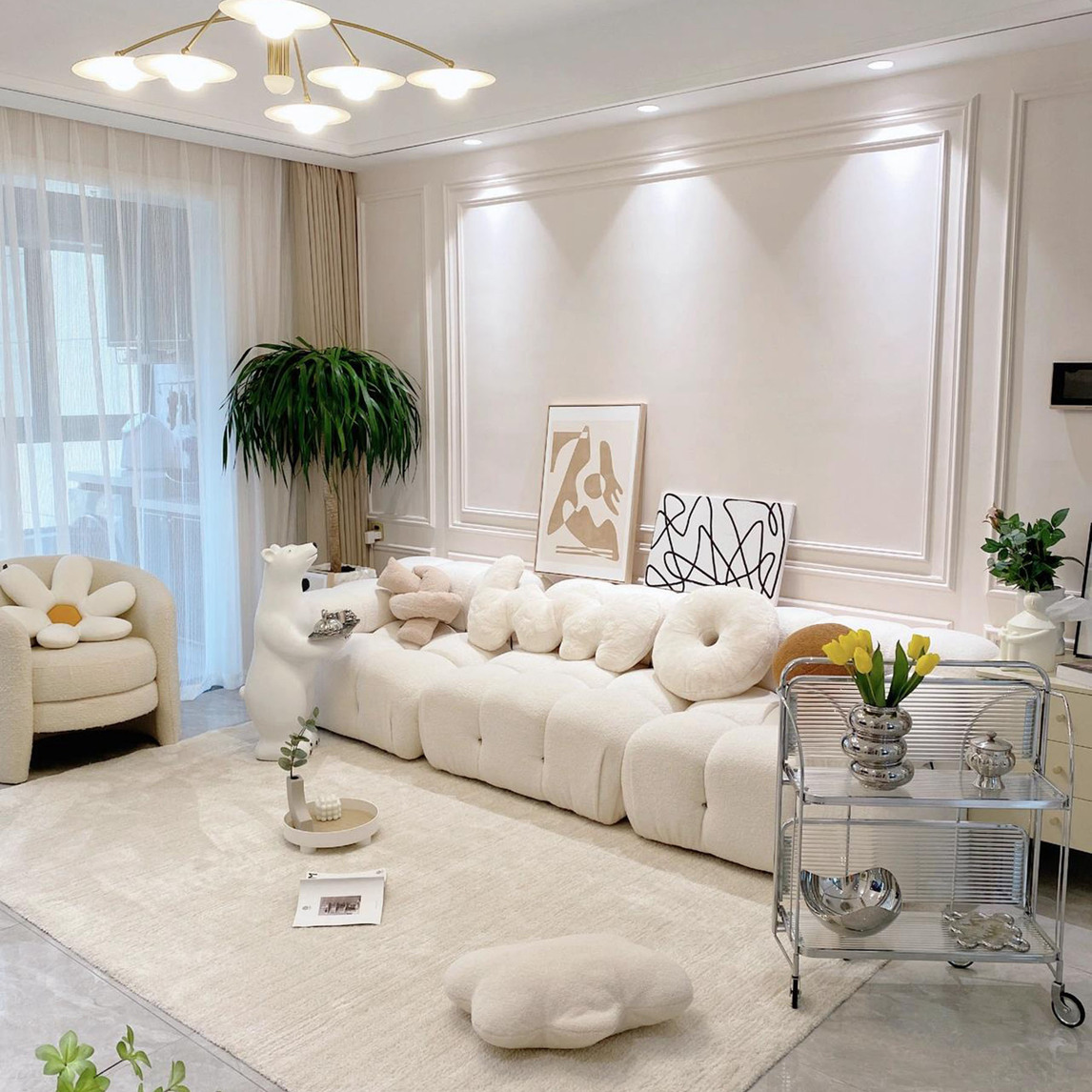 客厅主沙发是模块的造型软萌可爱,铺上浅绒的地毯更加高级,餐桌是岩板餐桌,岛台的造型非常有格调,旁边布置了轻奢斗柜,增加收纳空间的同时还美观。
