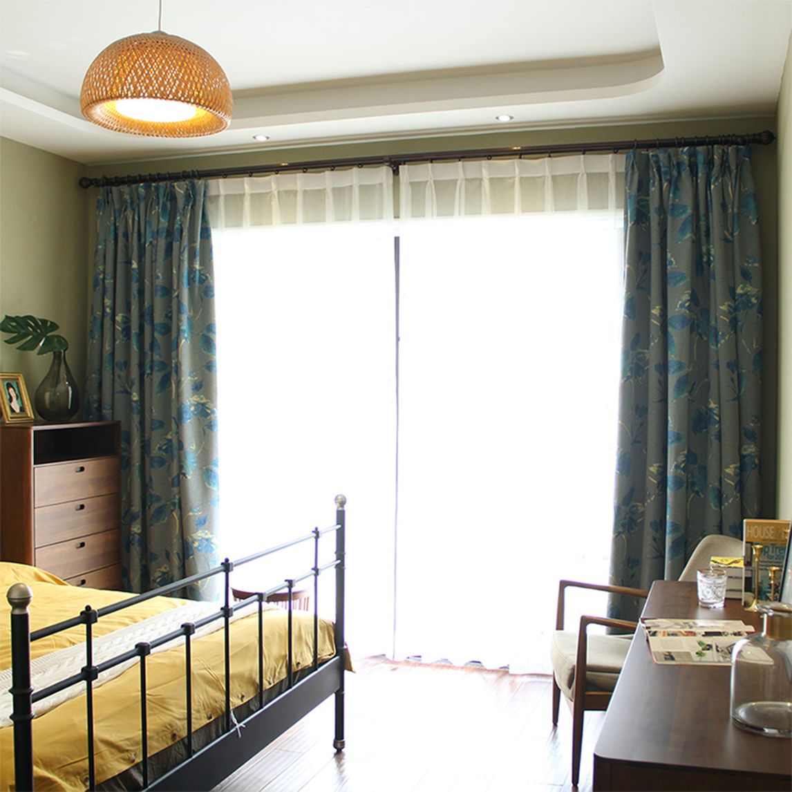 复古风的卧室通过家具与布艺软装添彩,厚重的色彩搭配提升整个空间的气质,黑色铁艺双人床腔调满满,木质家具又中和铁艺的钢冷,增加了暖色调!凸显出文艺气质。