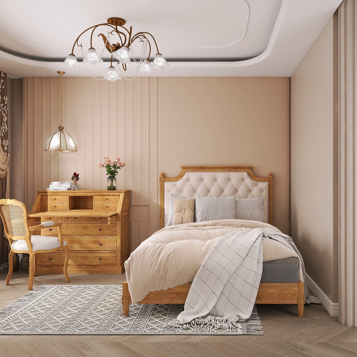 法式轻奢&现代极简,成为精致装修的新风向标; 呈现出来一种高质感的效果。 与素雅的客餐厅不同的是,卧室是奶茶复古色系,用温暖、温馨的方式拥抱需要放松的身心,给人以满满的安全感。