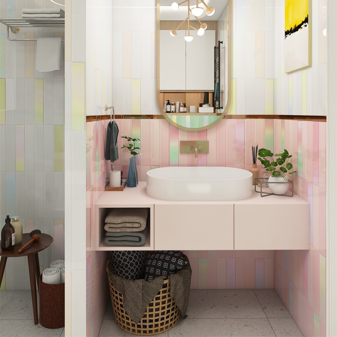 这款彩虹色系的长条砖用在卫生间真的是太合适了,每一个色系的砖都有接近的深浅变化,而且砖面还有一层独特的彩虹釉,在灯光的照射下就有彩虹的五彩斑斓,整个卫生间一下子就被点亮起来。