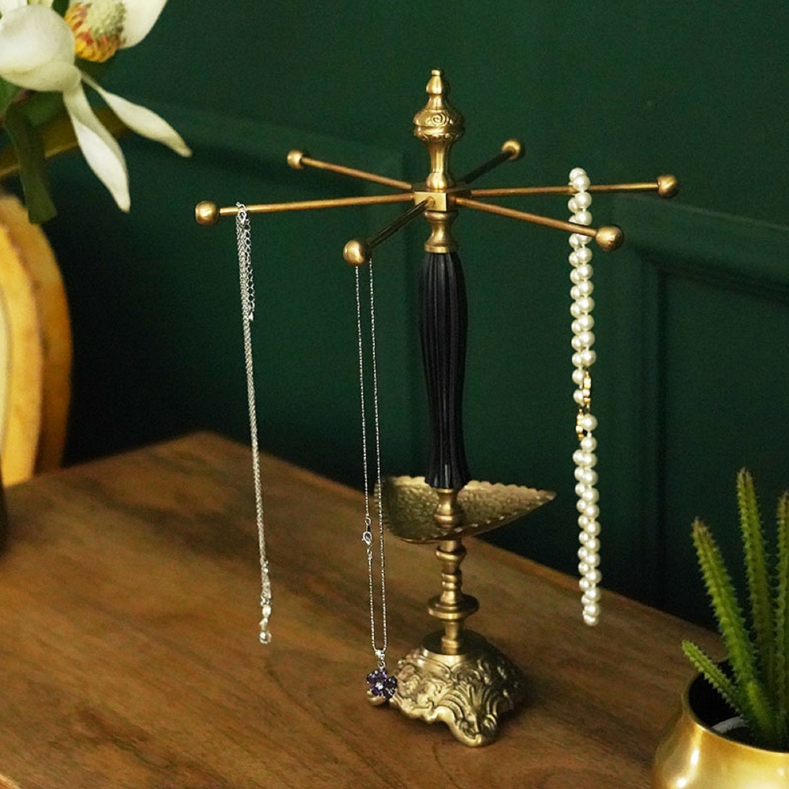 手工黄铜制品,质地坚固耐用,复古时尚的设计,为你的家居生活增添无限魅力!这种复古首饰收纳架,放在梳妆台上很好看,还不占地方!