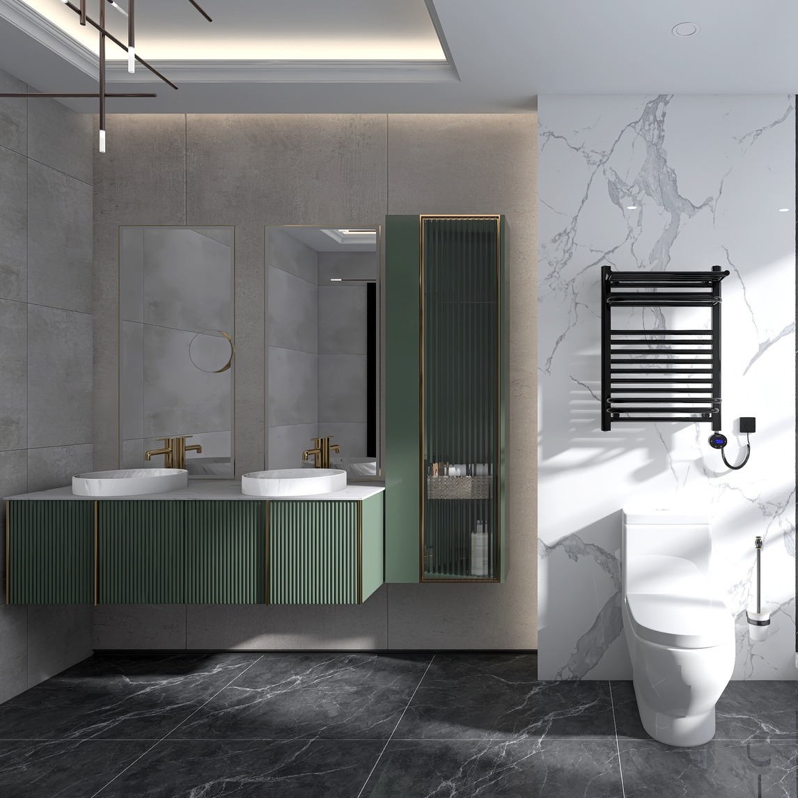 箭牌卫浴以打造人文卫浴,智能改善生活为基准的理念设计卫浴空间。该卫浴空间以绿色 为基调灰白色为主体打造舒适的轻奢卫浴空间。选品是箭牌新款定制高端浴室柜,性价比超高的AB1183马桶。