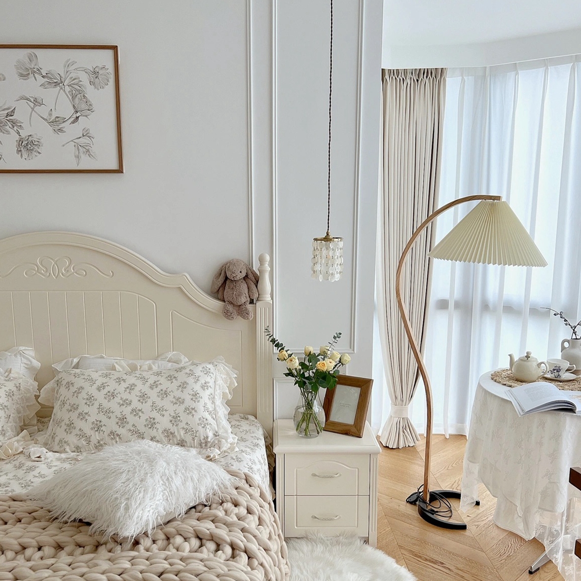 超喜欢奶茶色的法式卧室,颜值满分哦~ 灯具,床头吊灯,落地灯,温馨感十足; 荷叶边四件套点缀,满足你的少女心; 复古斗柜,收纳性强,实用性满满。