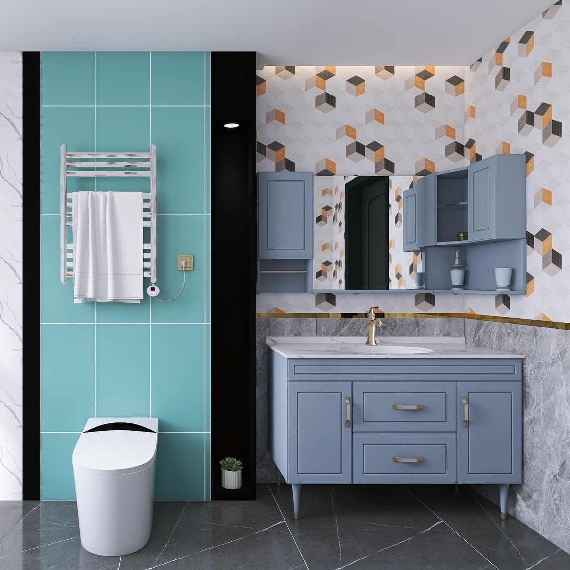 箭牌卫浴以打造人文卫浴,智能改善生活为基准的理念设计卫浴空间。该卫浴空间以蓝色为基调灰白色为主体打造舒适的轻奢卫浴空间。选品是箭牌新款定制高端浴室柜,性价比超高的AKB1310全智能马桶。