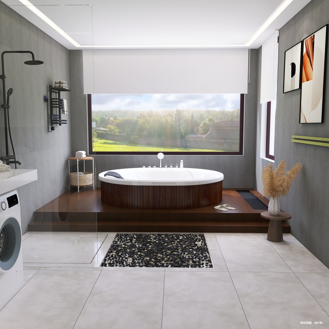 空间大的浴室可以在浴室种加入鹅卵石这种室外元素来增加氛围感,淋雨与浴缸进行分类,隔断做到了干湿分明,洗完澡后的衣服也可以在特别的边角摆放,较为方便。