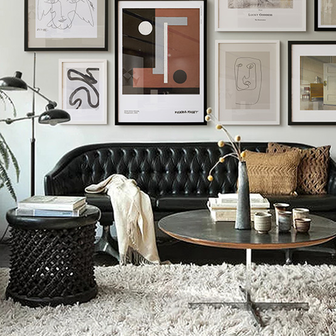 毛绒地毯,铺在地上很美观,主要是短毛的,工业风的落地灯和皮艺沙发很搭,墙上的装饰画也成了房间的大功臣!