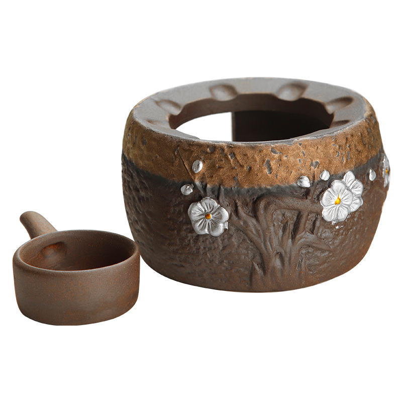 这是一款采用原矿釉经窑烧后自然显色的茶炉,器身梅花点点,浮雕设计立体逼真,呈现如銮金般的闪烁光泽,因而得以踏雪寻梅的雅艺之名,颇具复古文艺之风。搭配勺状蜡烛托,换取不烫手,小巧可爱,方便实用。文火摇曳...展开