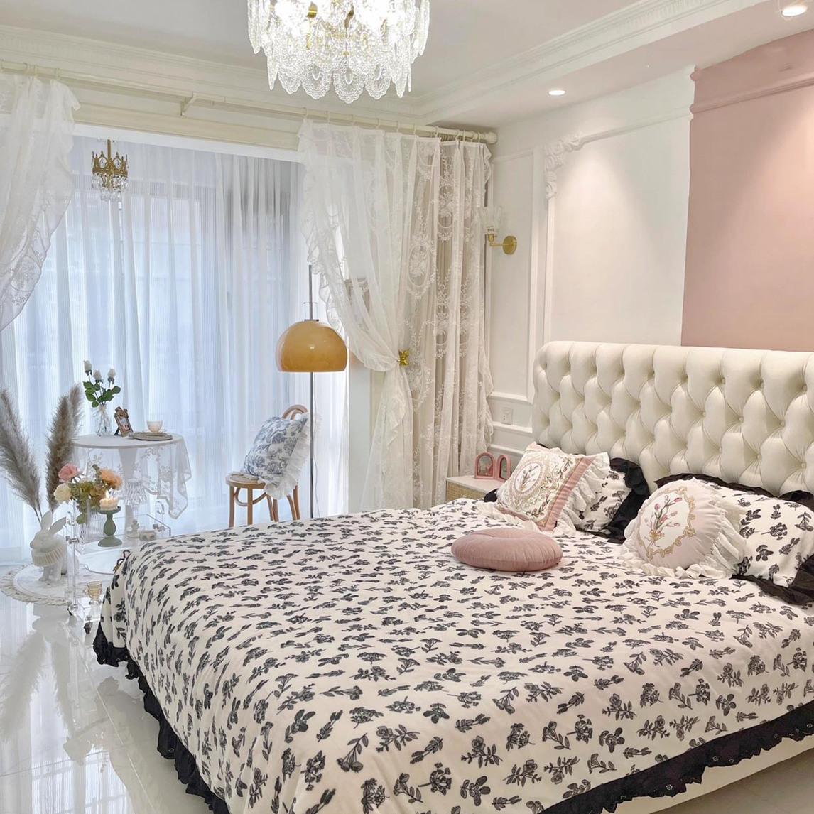 卧室的主灯是法式风满满的双层水晶灯,三色光源非常实用,铺上了超级喜欢的床品好爱法式荷叶边,整个卧室都散发出温柔的气息。