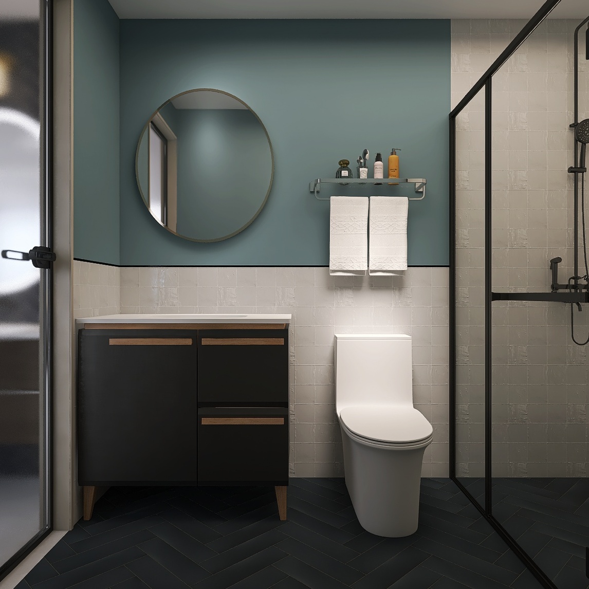 当颜色与颜色碰撞,生活从此变得精彩万分! 当视觉赋予手的触感,用眼睛就能感觉瓷砖的温度!深邃的蓝色长条地砖碰撞白色珍珠质感釉面墙砖,满满的高级复古感。不锈钢毛巾架在不破坏整体颜色同时还能收纳洗漱物品