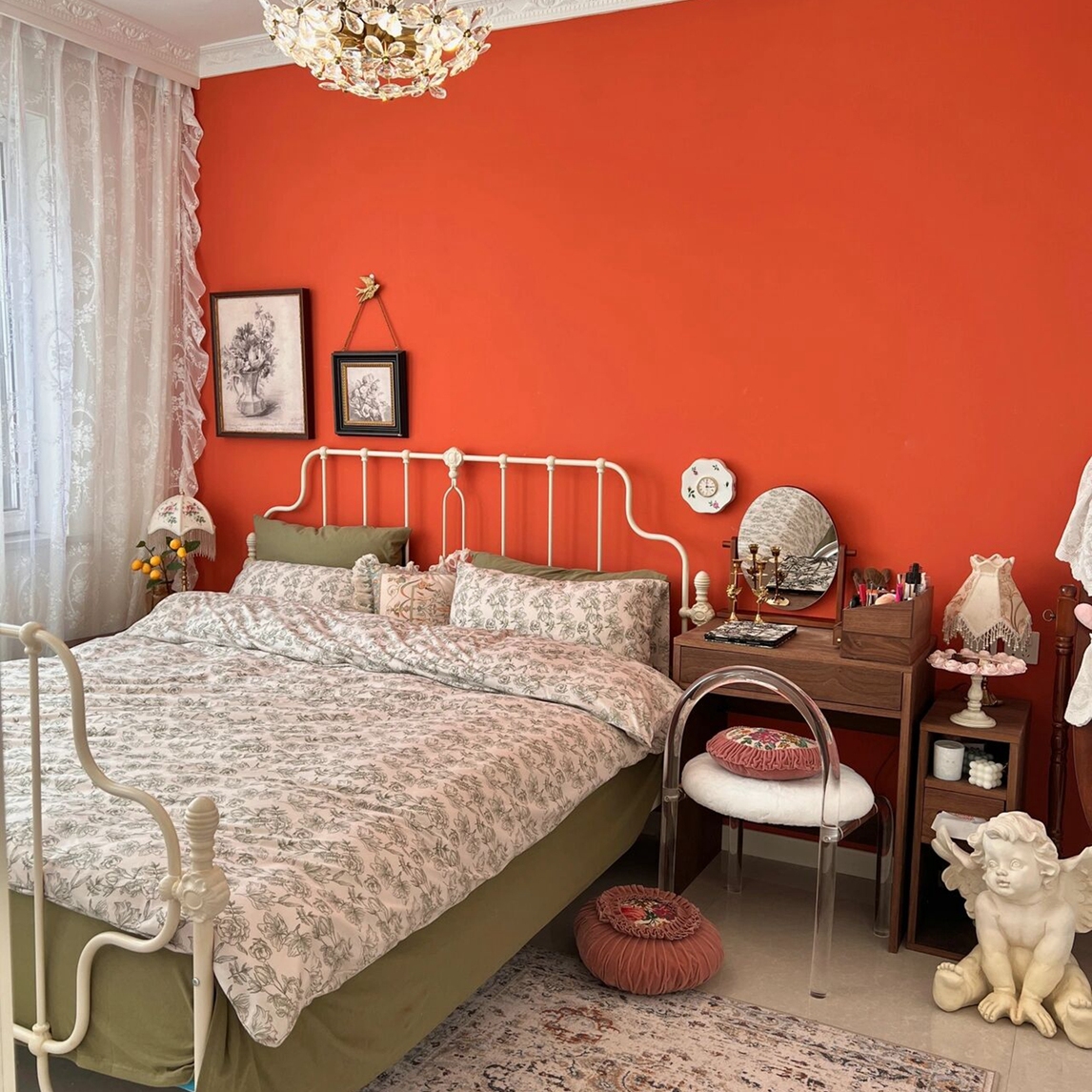 冬天的色彩搭配应该是纯粹、温暖、低调的,床品素色带花,多了几分低调、内敛,床边安排了一个亚克力椅子,造型很有创意,就像一个艺术品。