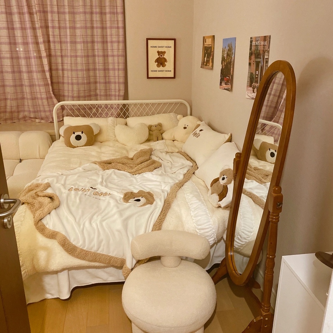 温馨复古的调调,久看不腻~ 实木复古穿衣镜,颜值满分; 格子窗帘,简直就是大爱,看不腻; 加绒冬季四件套,暖暖哒,不要太舒服。