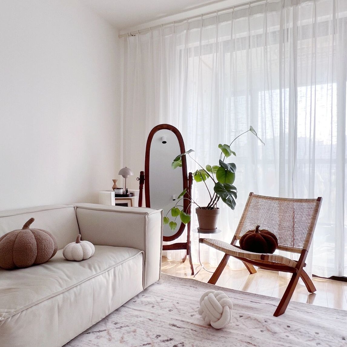 客厅主沙发是极简的造型,科技布面料,非常好打理,搭配的实木穿衣镜复古又很有质感,见证从头美到脚的瞬间。