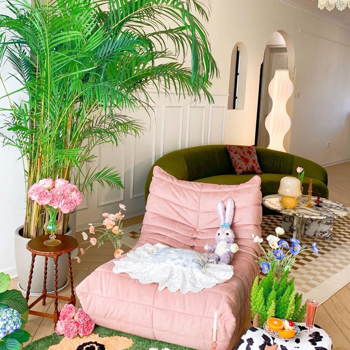 这个粉色毛毛虫沙发葛优瘫太舒服啦,高密度海绵久坐不踏,家里的任何角落都可以搬动,万花从中点缀了一些绿色,圆形小狗地毯和散尾葵给空间带来了活力,超舒适、