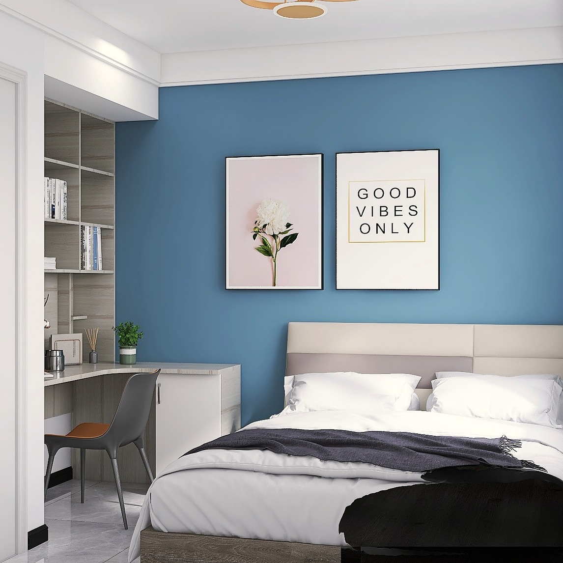 卧室比较小,但功能不能少,书桌带书柜的设计,一米五的板式床。颜色上整体用浅色调,灰色系的书桌床,配上蓝色的床头背景,让卧室安静又不失单调。