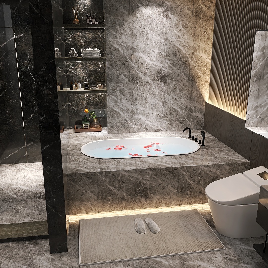 现代轻奢崇尚精简的视觉感观,但并不意味着缺失细节,利用细节能够有效提升整个卫浴间的精致程度。墙面的多材质拼接,多颜色拼接,奠定了整个卫生间时尚的基调。