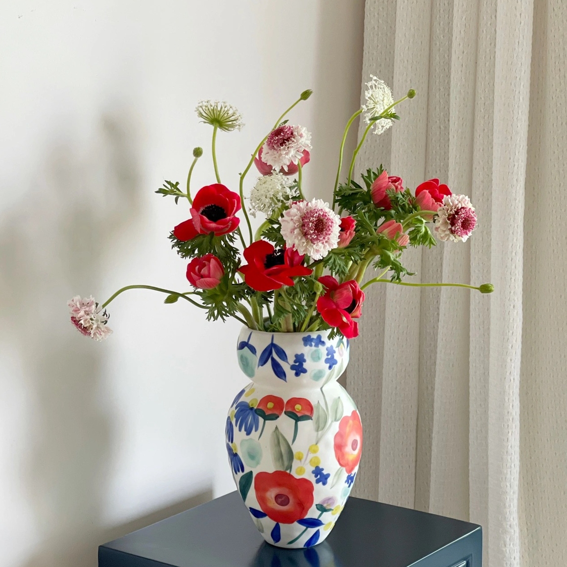图一到图三是比较复古的田园风花瓶,很特别的手绘设计,小清新风十足; 图四是中式花瓶,花纹超级好看,青花瓷花器; 图五花瓶,比较简约的设计,但是颜色很特别,超美。