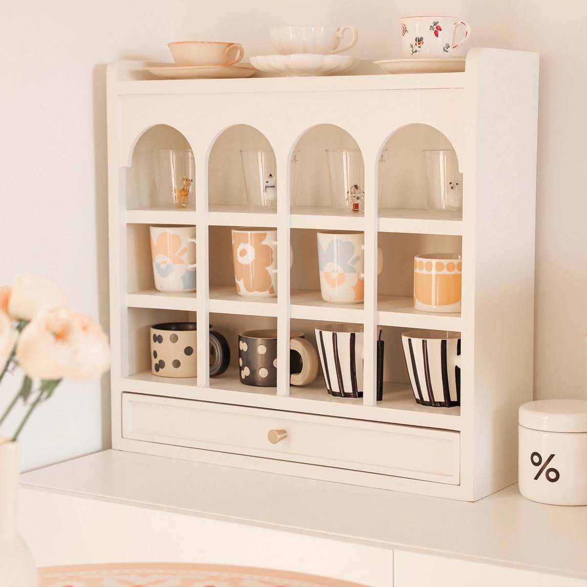 可以同时收纳12个杯子的收纳架,底部还自带一个小抽屉,可以放茶包之类的小物件,泡茶超级方便哦。密封收纳,可以保证杯子不落灰。