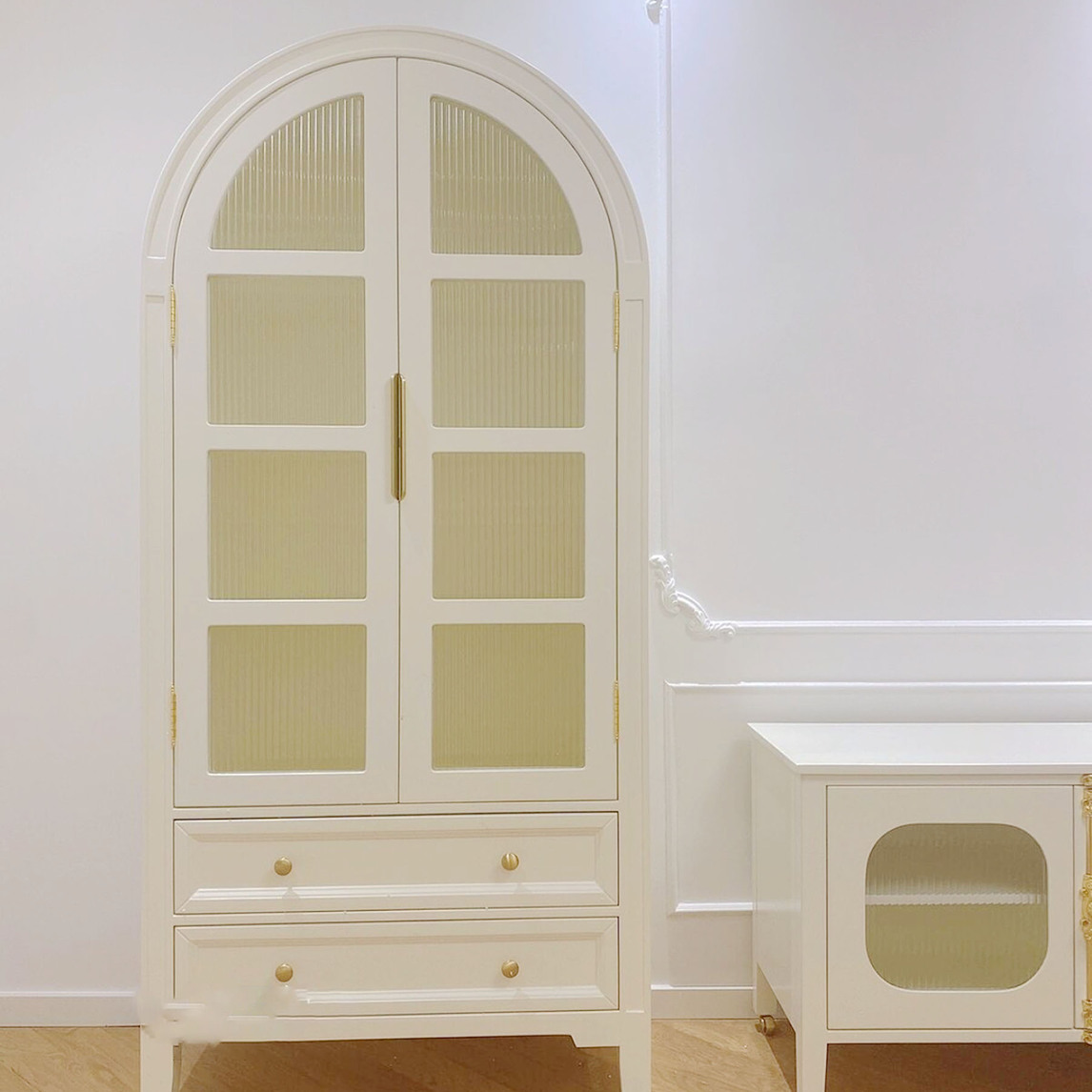 特别适合法式装修风格的柜子,法式拱门设计,多层收纳增加储物空间,玻璃门设计能随时看到里面的物品,还能当展示柜使用。