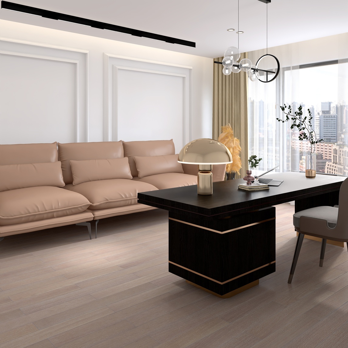 法式设计的书房,皮质沙发,让书房更显轻松和质感,背景墙是石膏雕花线条设计,吊顶内嵌灯带,有氛围感也能起到装饰照明的作用。应该不用担心采光问题,大扇落地窗,拉上遮光性能很好的窗帘,很方便,室内有玻璃吊灯...展开