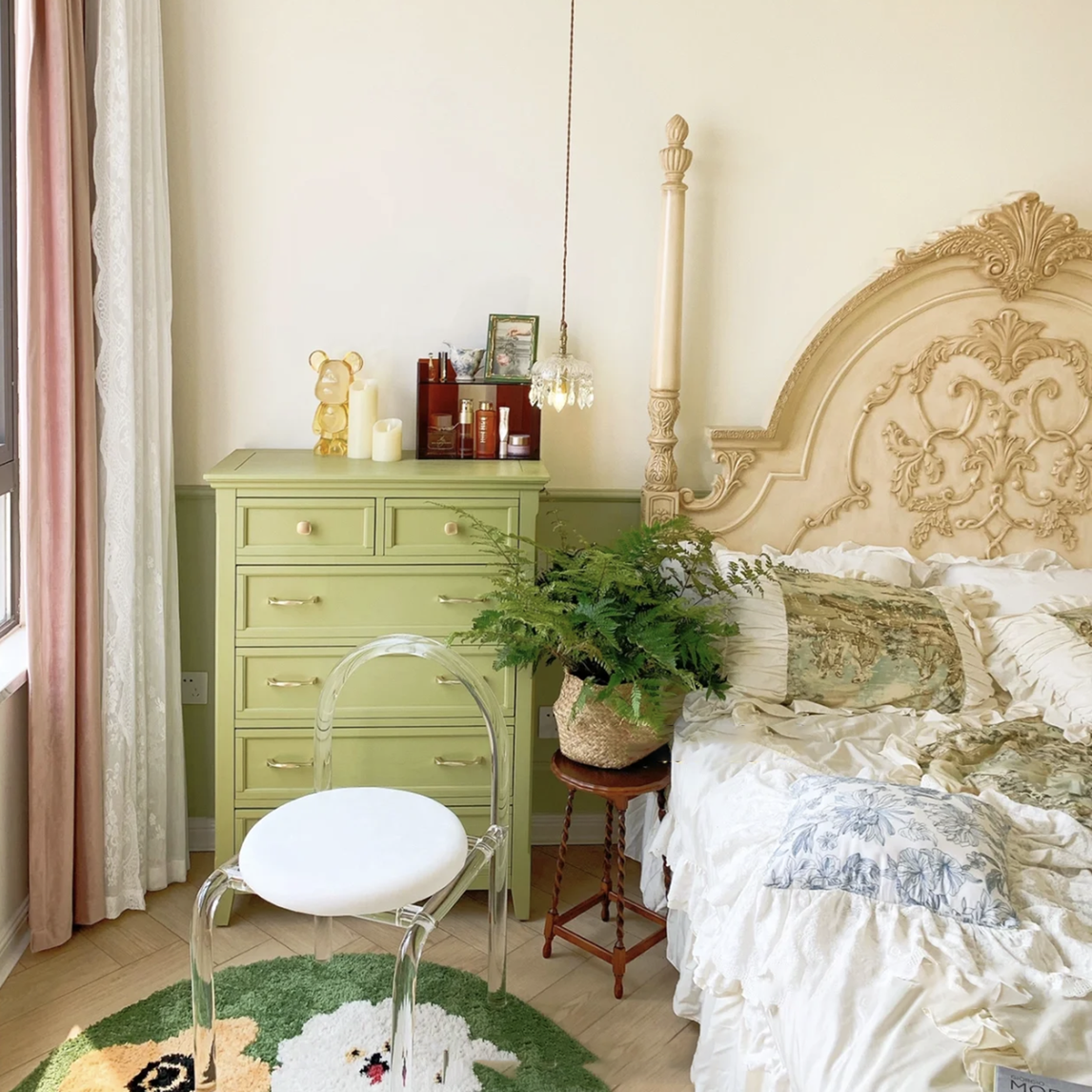 大胆尝试法式风吧!又好看又省钱,每天感觉自己是小公主住在城堡里,ins水晶椅子跟卧室很搭,美得像悬浮在空气中的艺术品,每次坐在这里化妆或是看书,感觉自己像童话里的小公主一样~
