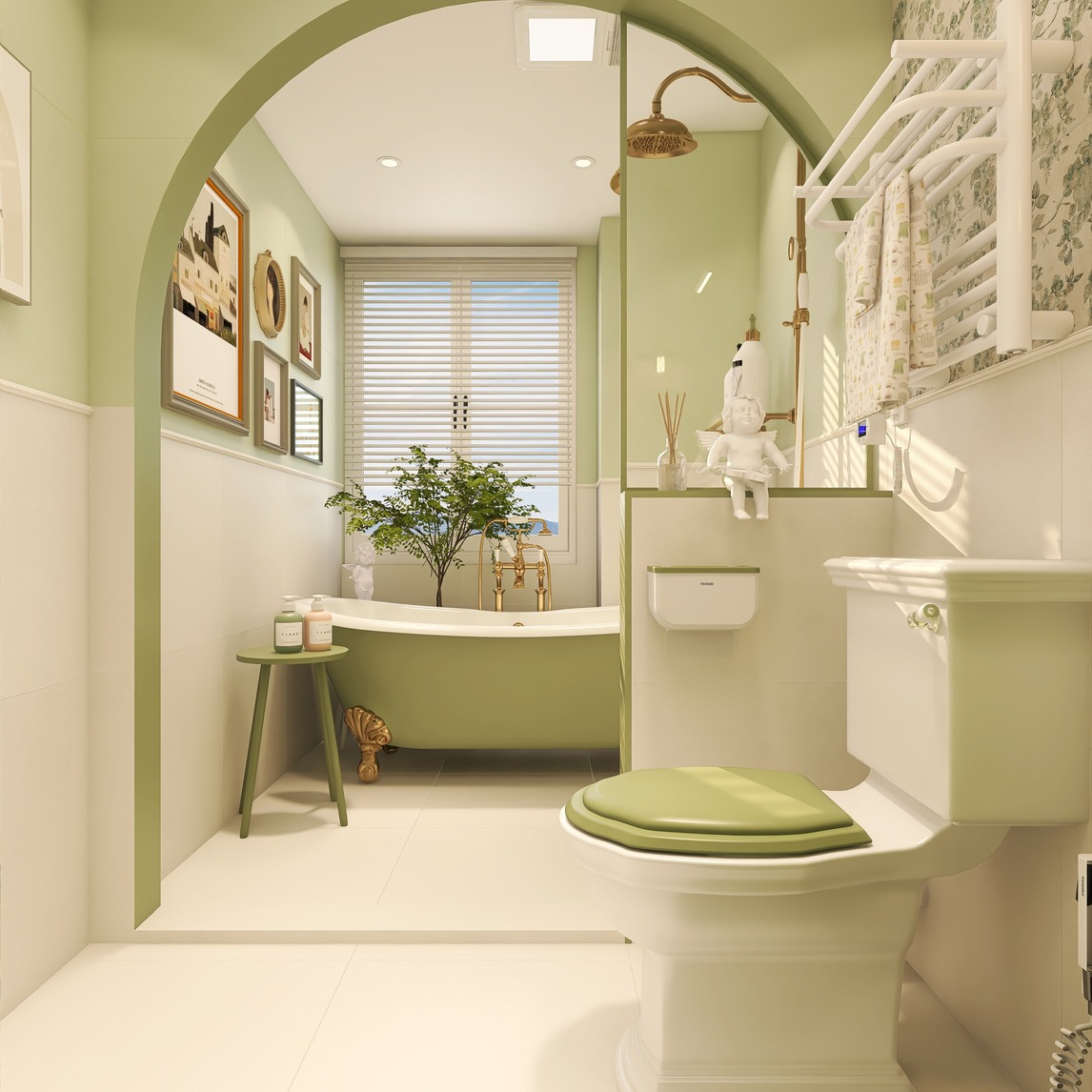 使用微水泥瓷砖,以简单的装饰和绿色色调,并借助光线来扩大空间感。在表达光和影的同时,打造一个极具绿色自然画面感的卫生间。