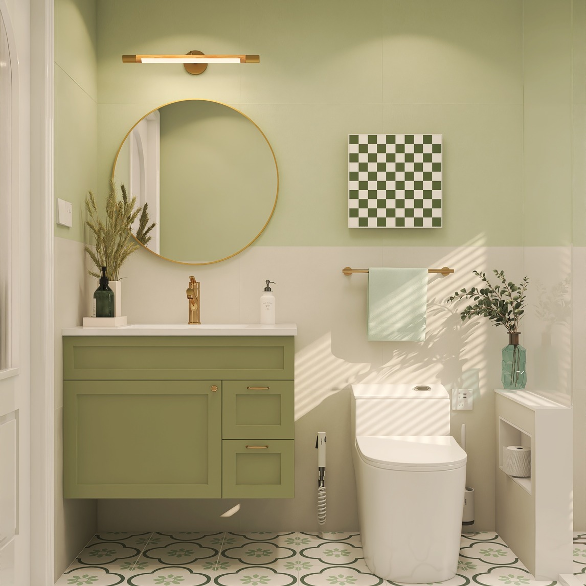 绿色半墙设计与不规则花纹的小地砖下,赋予了节奏感,挂一幅绿色格子棋盘挂画的卫生间,没有了空旷感看起来更加自然舒适。