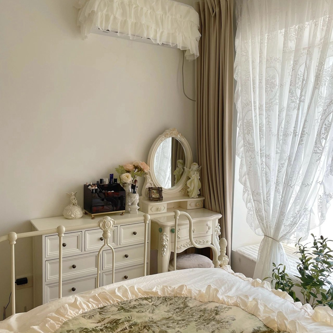浪漫的四件套,复古风很适合与法式的水晶吊灯搭配在一起,仙气飘飘,超级好看!还有浪漫的蕾丝窗帘,更美啦!梳妆区也不要忘记了哦,实木斗柜也需要,可以收纳卧室的一些小东西。