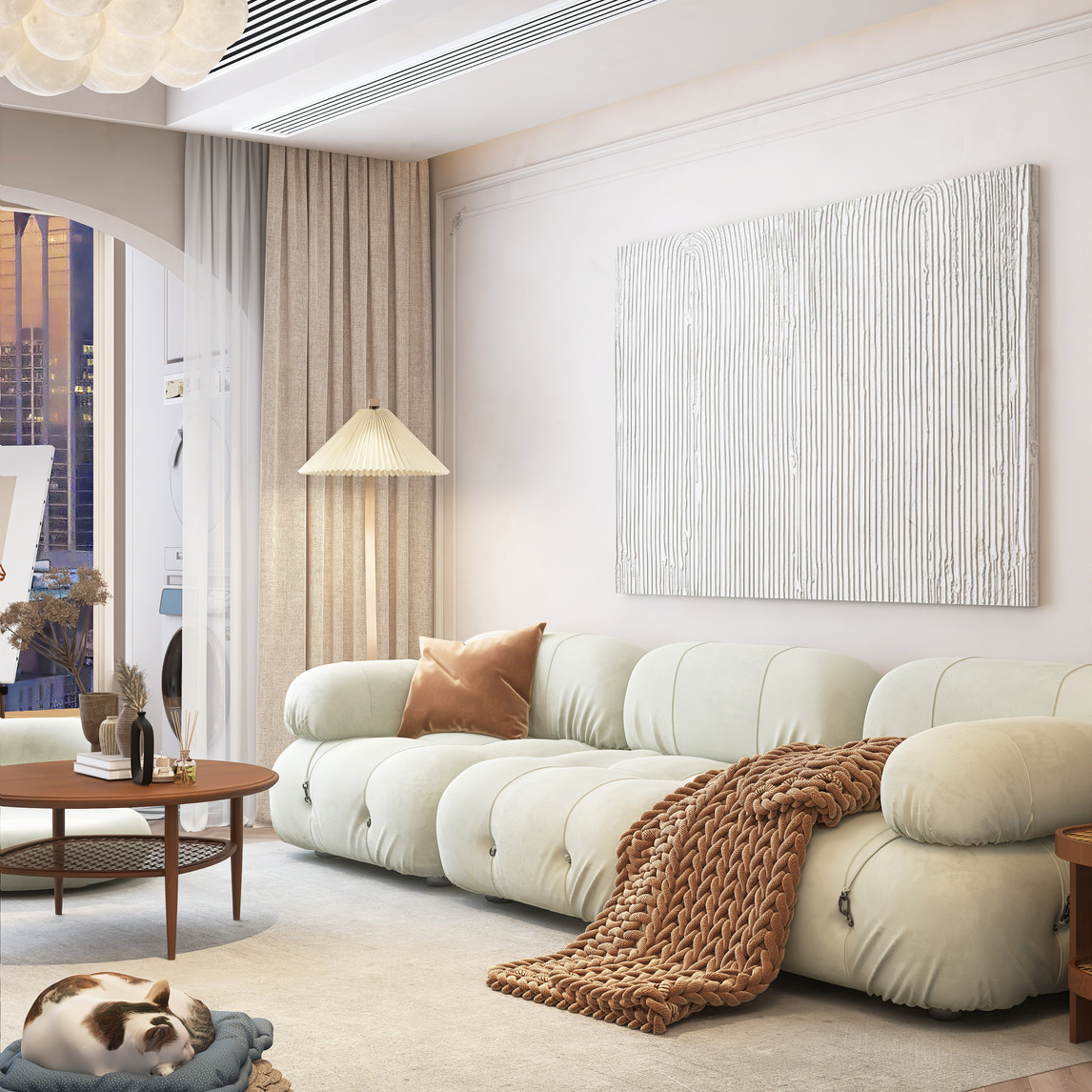 奶油色系色调、慵懒的沙发形态、带藤编元素的茶几,艺术网红落地百褶灯,无论是色彩还是线条都十分的柔和,复古色系的搭配,温暖宁静,更显空间的优雅感。家具的选择都有着简练、优雅的外观,与其他空间融为一体,透...展开