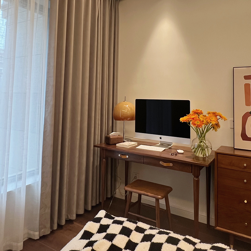 低饱和度的配色和杏色复古感十足的窗帘让整个房间温柔得像杏仁奶糖一般,主卧是法式轻奢风的香槟色系,搭配暖色灯光,简单又治愈!