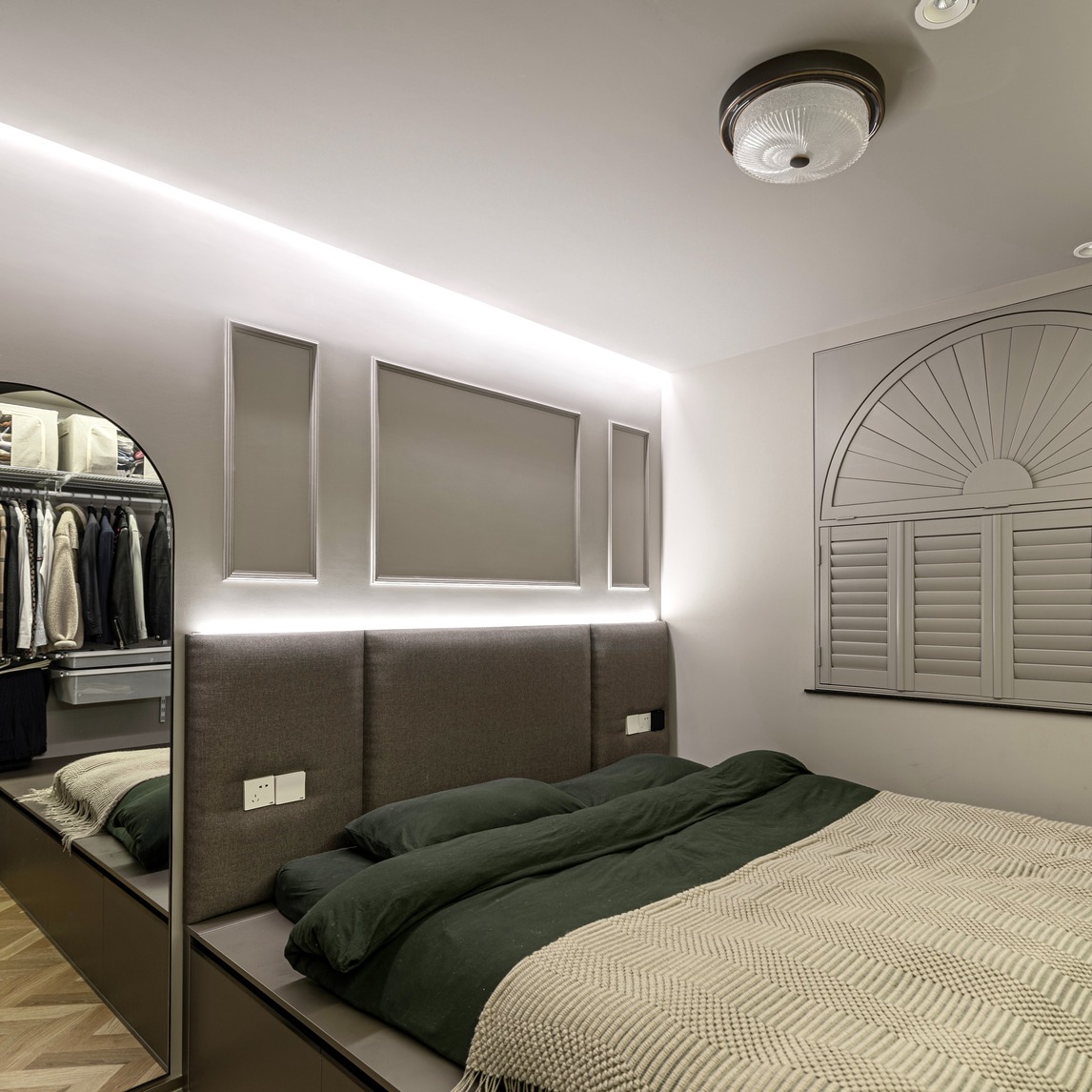 “小而美”,在空间设计中表现为在有限空间范围内融入设计对生活的理解和需求的认知,用精细化的手法,通过细节勾勒和氛围营造足够受众的精神向往。 整体的空间设计结合灯带与窗帘设计,既实用又美观。风格与客厅相...展开