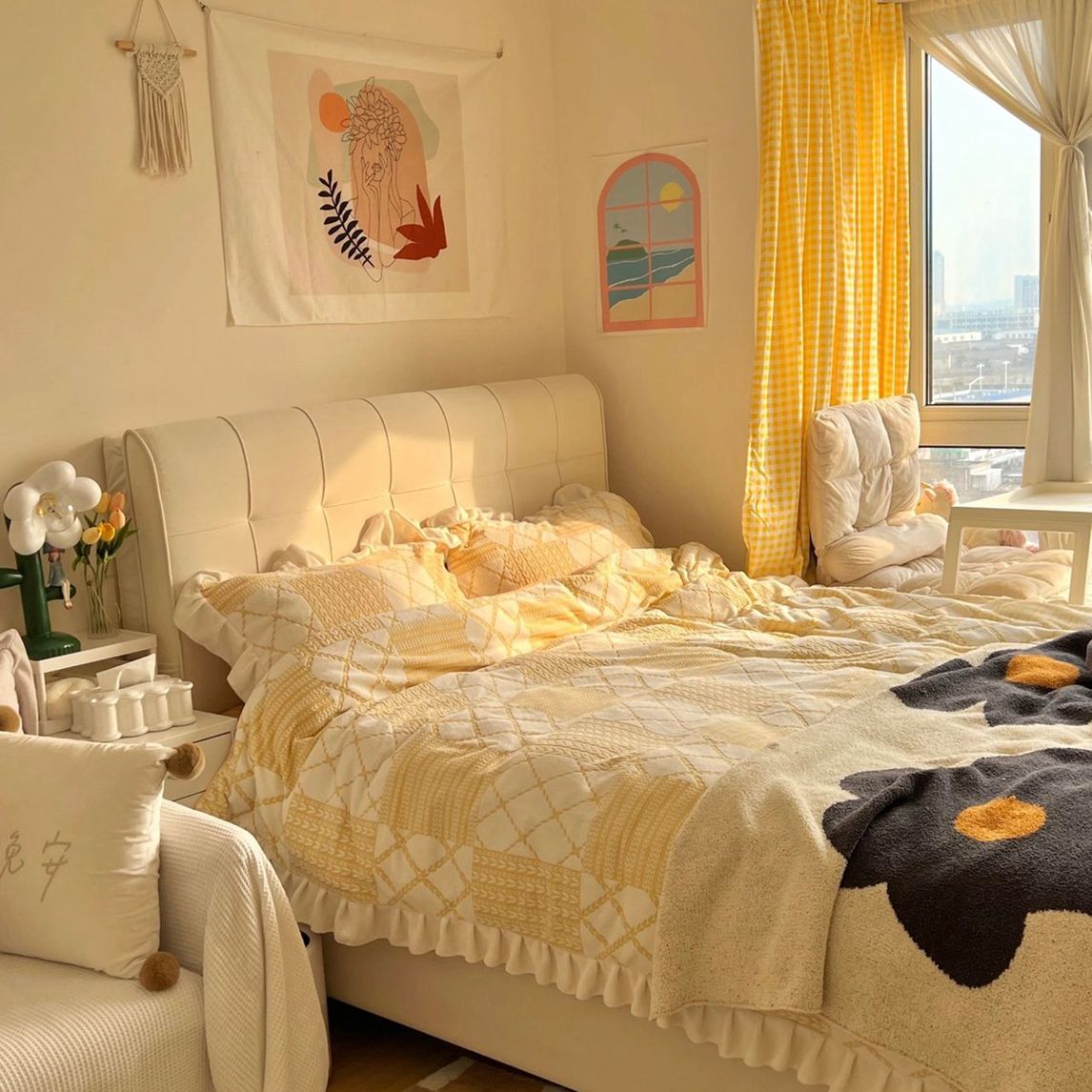 住在这样的卧室,每天都是少女心呀。 温暖明亮的窗帘,格子花纹经典不过时,铺上少女感满满的四件套,墙上的ins风挂布,简单装饰却能成就大美卧室
