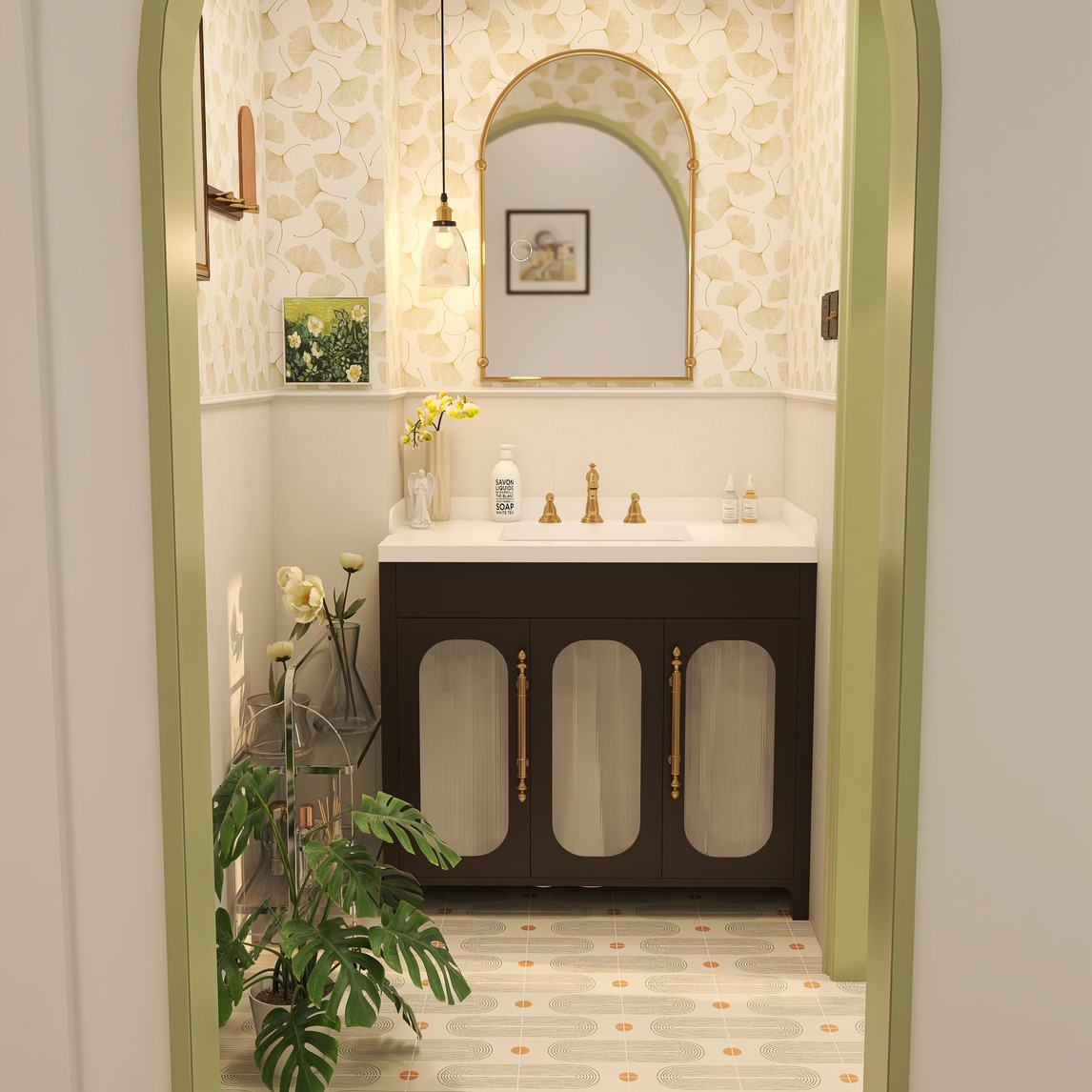 在这个卫生间里,黄色与银杏叶花纹,似傍晚中一轮圆月柔光照耀的避港,加上吊灯氛围,带来精神上的舒适,透出一抹淡淡的干净的气息。