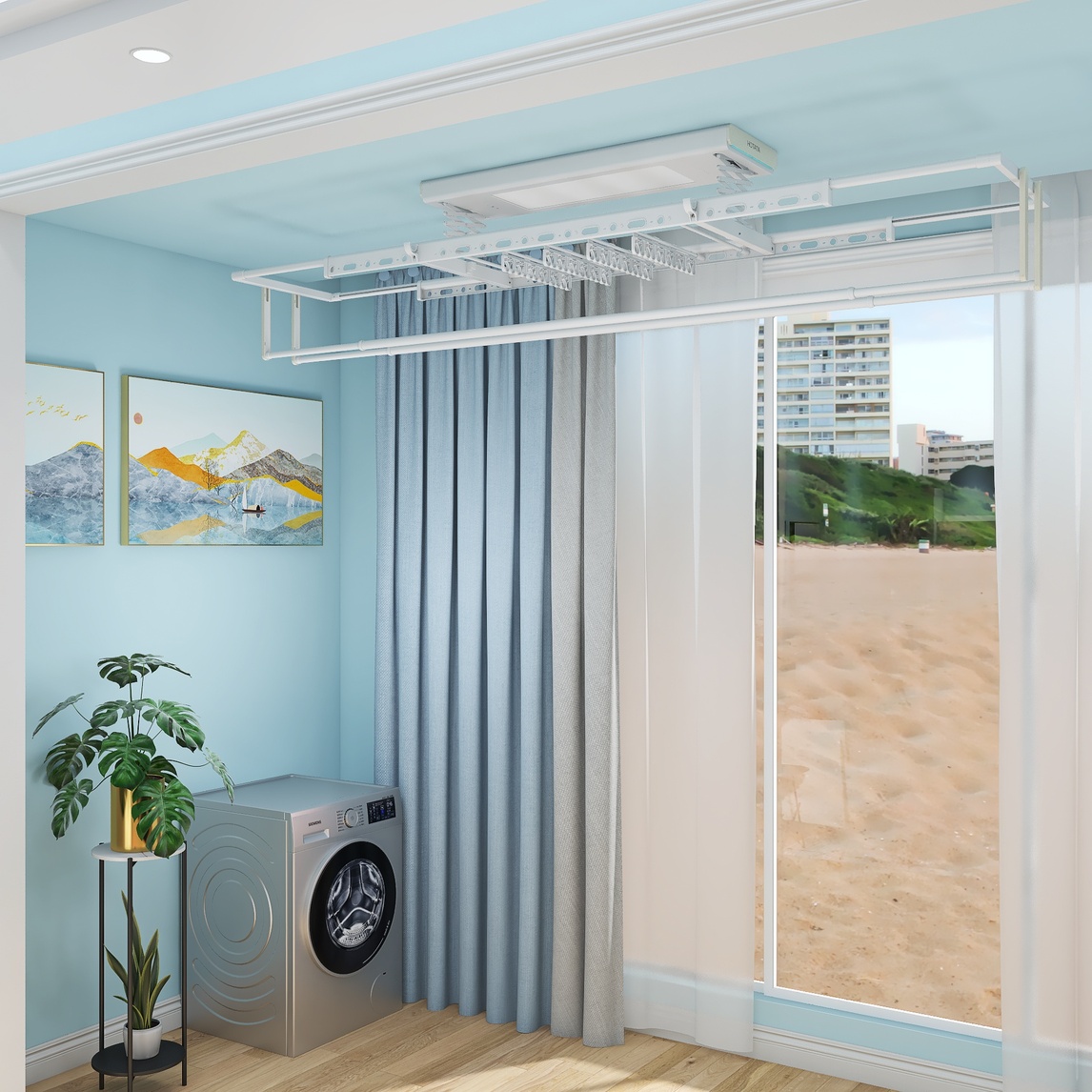 阳台要清爽、要干净,可以尝试蓝+白色搭配。浅蓝色墙纸搭配雾霾蓝窗帘,让阳台瞬间降温。再搭配白色晾衣机及挂画,降低蓝色饱和度,让整体空间更和谐。
