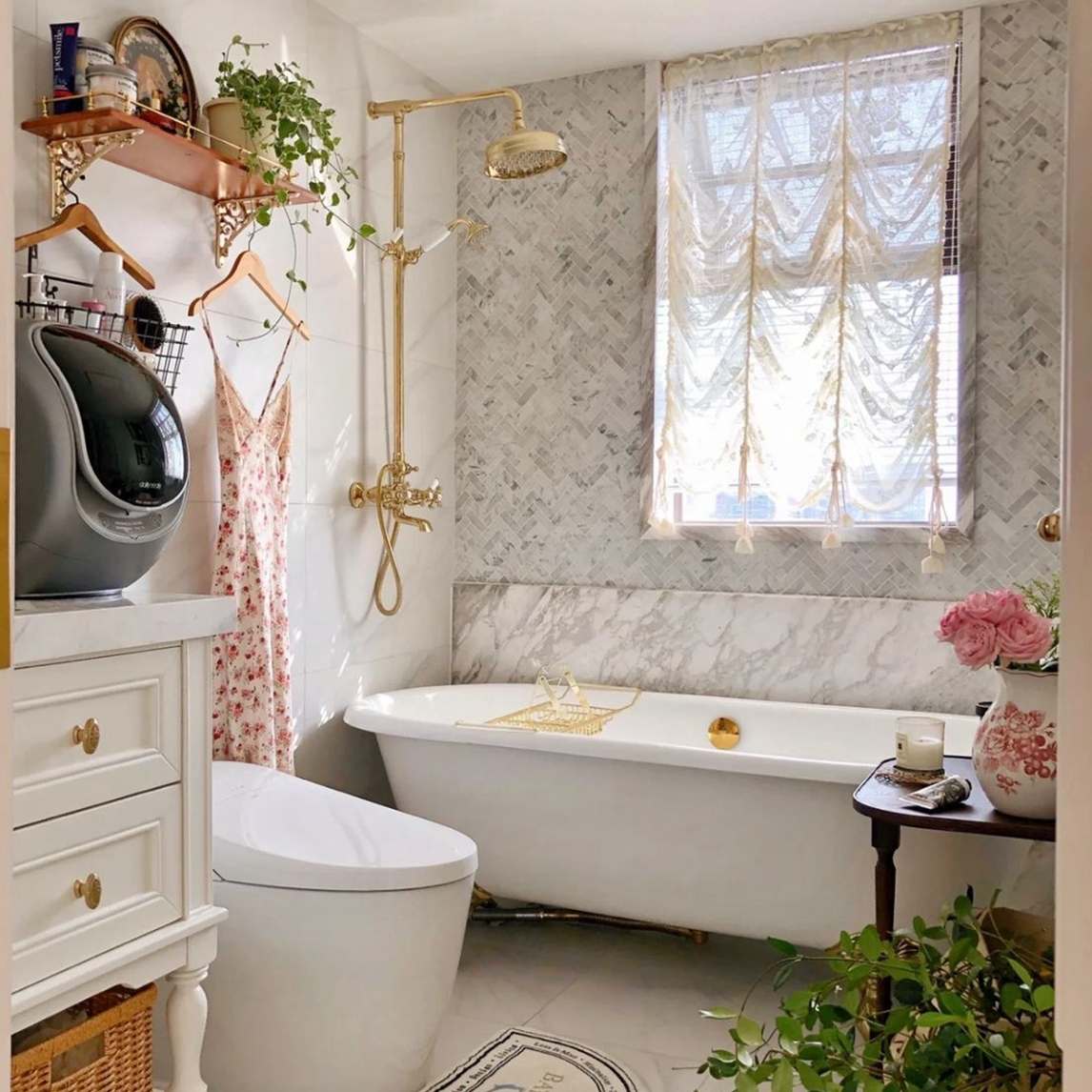 法式复古风的卫生间,真是养眼又精致呀,放上鱼缸,虽然利用率低,但是偶尔泡澡放松一下很有幸福感。放上一台内衣洗衣机,解放双手,安上智能马桶,真的超方便,把浴室装扮成自己爱的样子吧!