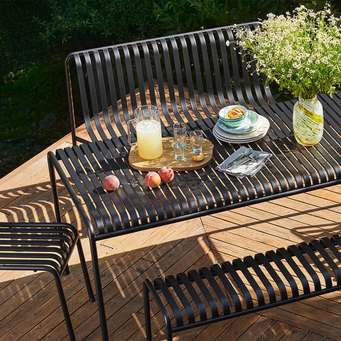 北欧设计的铁艺户外桌椅组合,营造出夏日休闲,自带清凉感。流光般绚丽的玻璃花瓶,一下子增加庭院的氛围感。