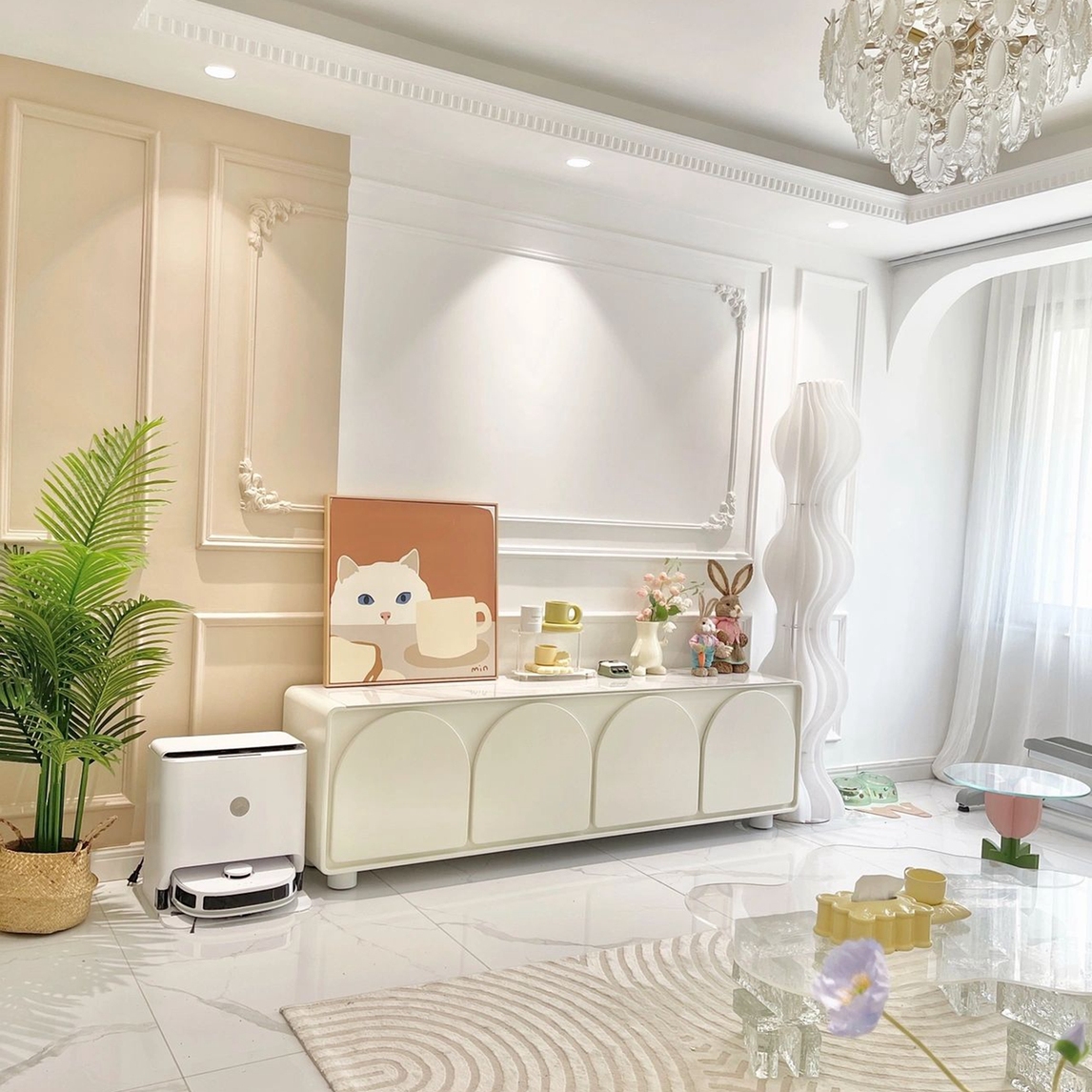 每天最爱的宅在客厅地毯上追剧吃吃喝喝,真的太惬意啦 ,于是入手了扫地机器人,可以自动清洗拖布,洗得还是挺干净的很省心,边扫边拖很干净,边边角角的垃圾边刷基本可以扫到,电视柜拱形抽屉特别有设计感,放在客...展开