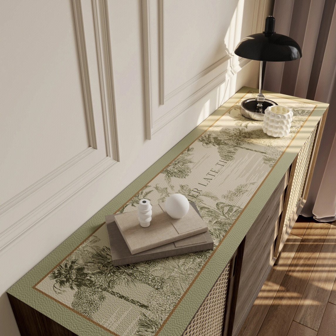 经典的茹伊印花到欸低饱和度的草木绿,既有法式的浪漫又有轻奢的时尚感! 皮革的材质易打理,还防油防烫,而且2mm厚度放置东西稳定的同时还能保护桌面!