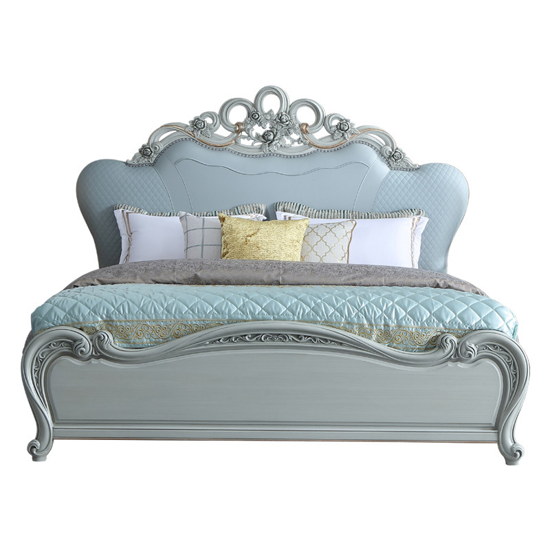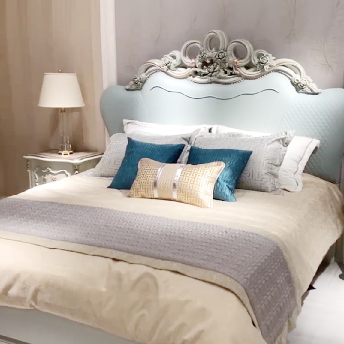 法式风格的卧室双人床精致的描金花纹图案,加上裂纹白色底漆,摒弃了传统欧式家具的严肃压迫感,营造出旁人所艳羡的法国贵州奢华,浪漫的生活氛围。