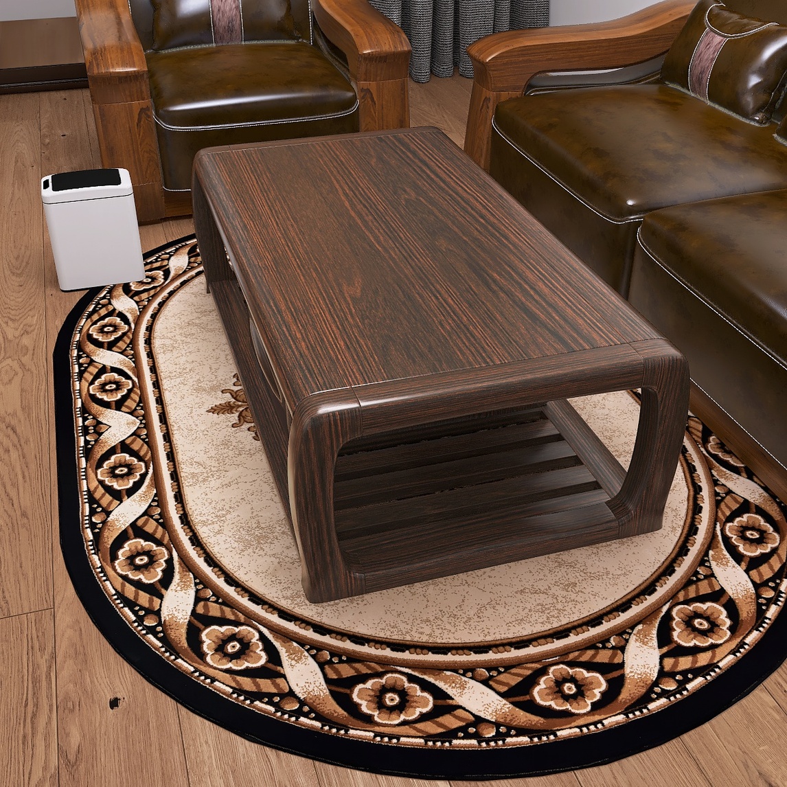 皮质木艺沙发结合黑金圆毯,构筑沉稳华美基础,佐以地板、挂画装饰,在屋主一家严选的古典家具衬托下,以内敛姿态铺陈古典奢华