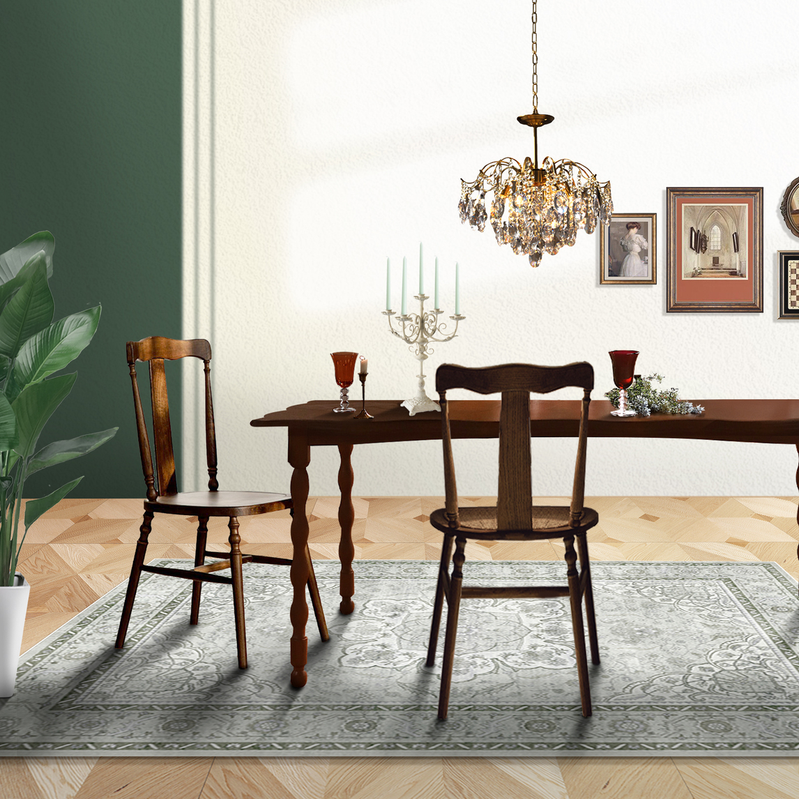 绿色复古花纹的地毯,应用在家中装修是为了有一种“住在春天里”的感觉,而“在春天里”吃饭也是别样风味。