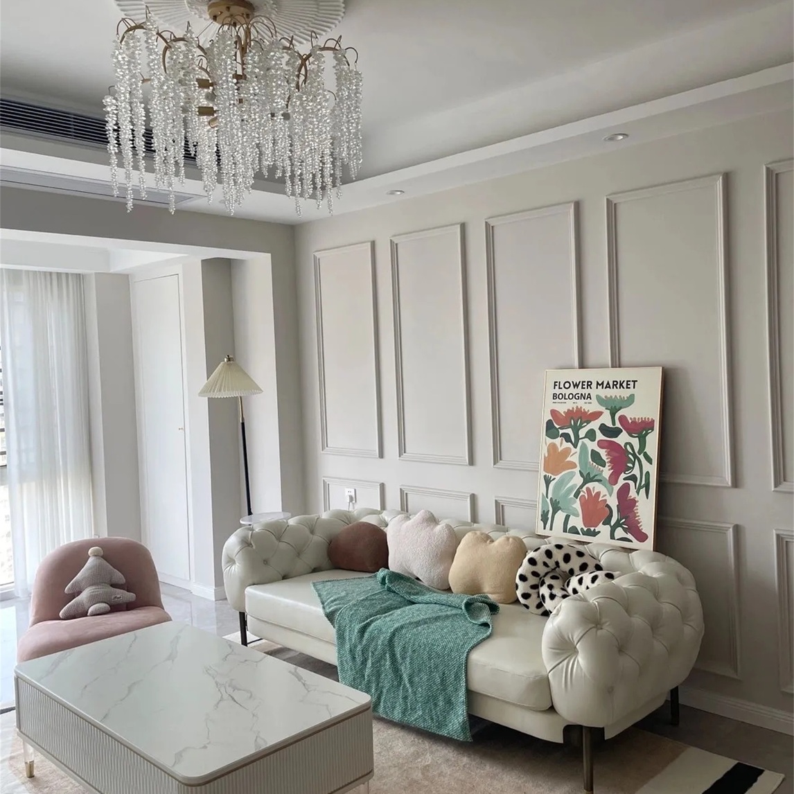 整体的色调都是暖暖的,色彩感觉很棒,奶白色的墙搭配奶白色的沙发,整体感觉十分统一,个性的地毯,好似点睛之笔,让整个空间看起来活泼生动,不至于那么死气沉沉。