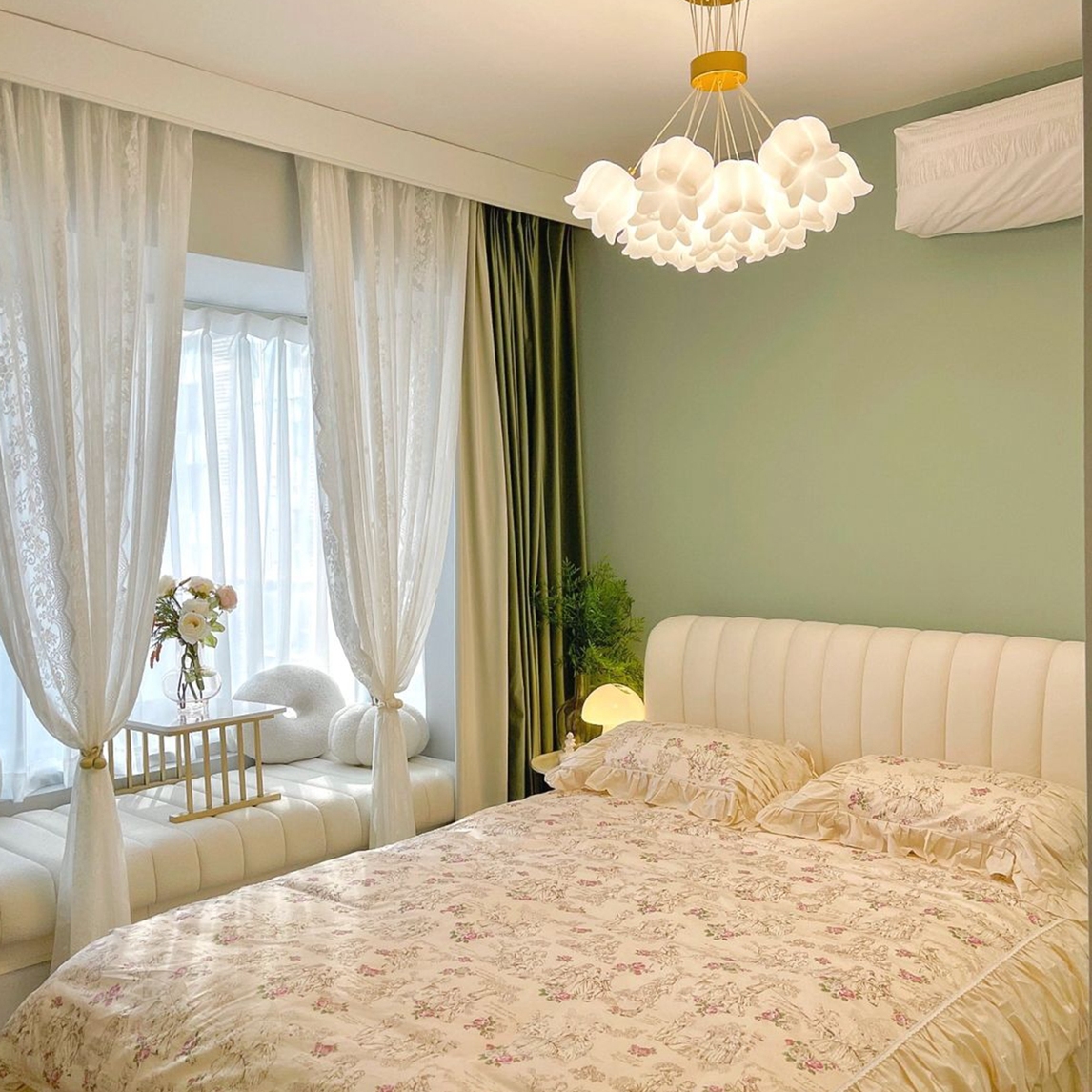 好喜欢浪漫氛围感的卧室,超级美的!浪漫的铃兰吊灯,蕾丝窗帘,搭配简约大方的双人床,简直就是梦中情房。